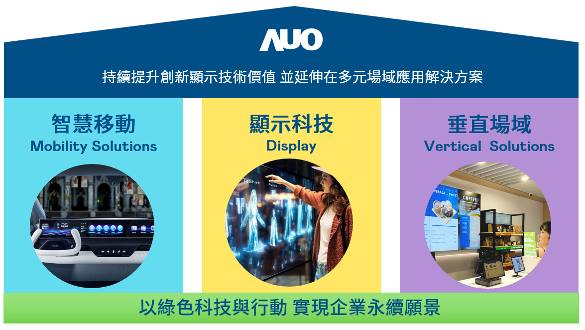 我們持續推動「雙軸轉型」,在精進顯示技術附加價值(Go Premium),與深化垂直市場應用(Go Vertical)的策略下,對應凯发k8官方网站登录的優勢競爭力與趨勢,我們奠定顯示技術、智慧移動、垂直場域三大永續營運支柱,在顯示技術領域的根基之上,延伸布局多元場域應用解決方案。將先進顯示科技助力智慧移動及垂直場域發展,並以綠色科技與行動為實踐,在轉型之路上貫徹永續經營之願景。